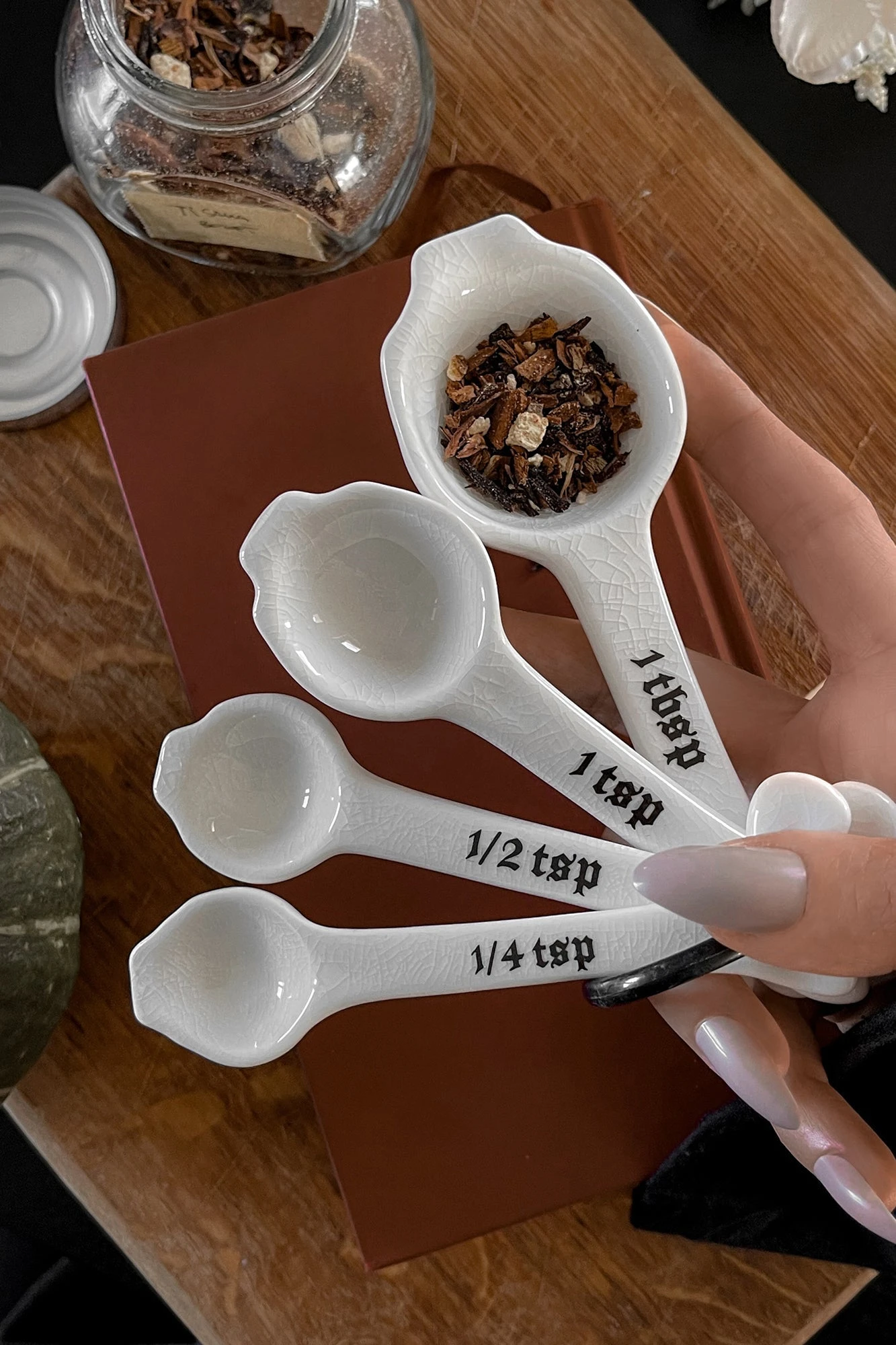 – Statement cream ceramic measuring spoons.