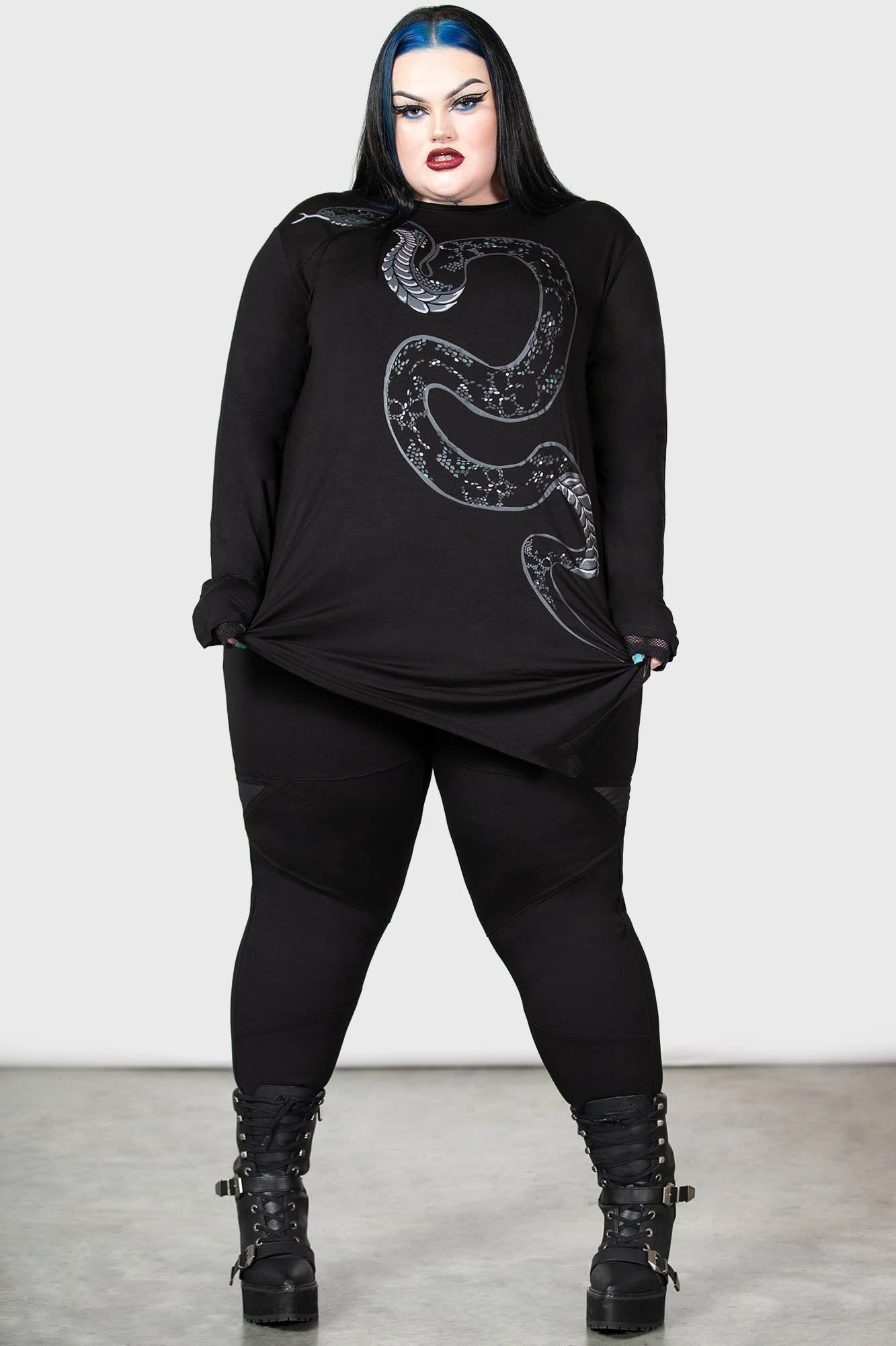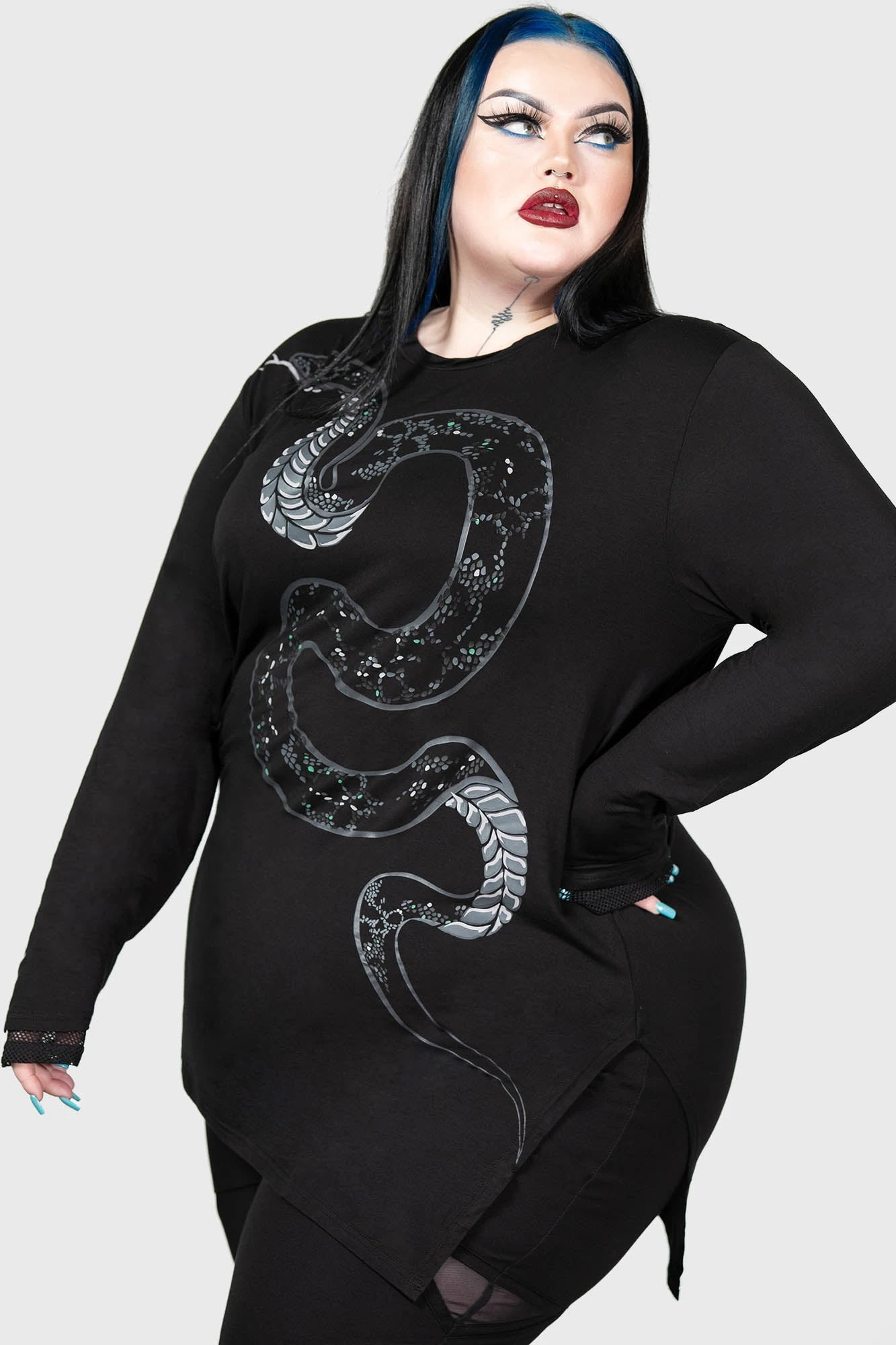 Embrace the shadows with the KILLSTAR Aniliidae Top, a standout piece from our plus-size collection. This unisex top merges gothic aesthetics with modern edge, featuring a striking snake graphic that commands attention. Whether you are building an alternative daily look or styling for a night out, its unique silhouette and signature KILLSTAR details provide an unmistakable presence.