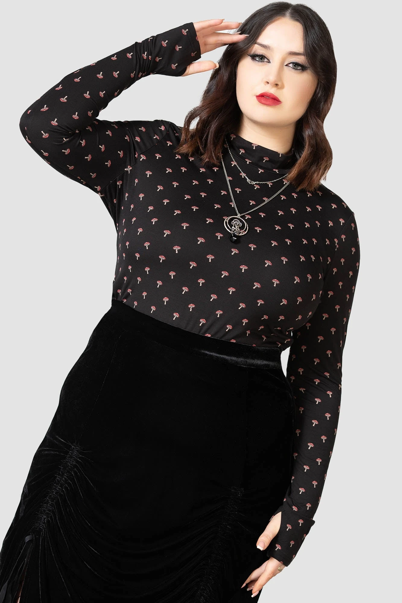 Elevate your alternative wardrobe with the KILLSTAR Dapperling Long Sleeve Top. Part of our exclusive collection, this piece combines a dark aesthetic with a whimsical mushroom motif, perfect for those who want to stand out. Crafted from a premium soft-touch stretch fabric, it offers a sleek, fitted silhouette that celebrates your curves while providing all-day comfort.