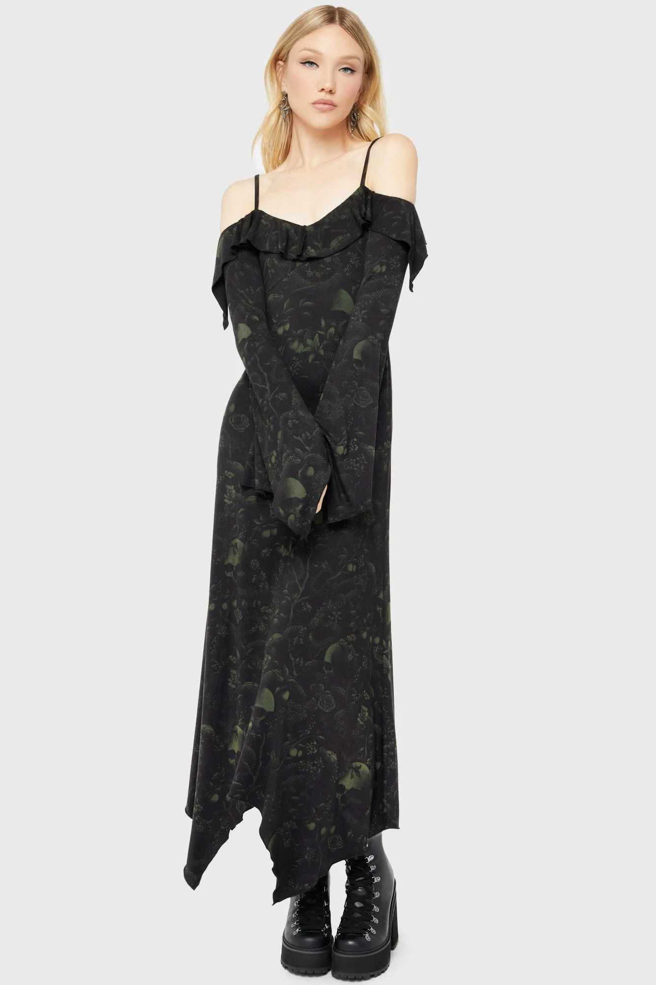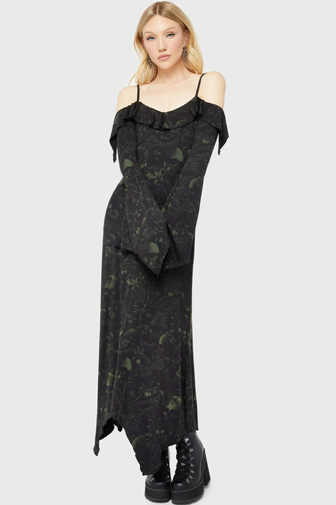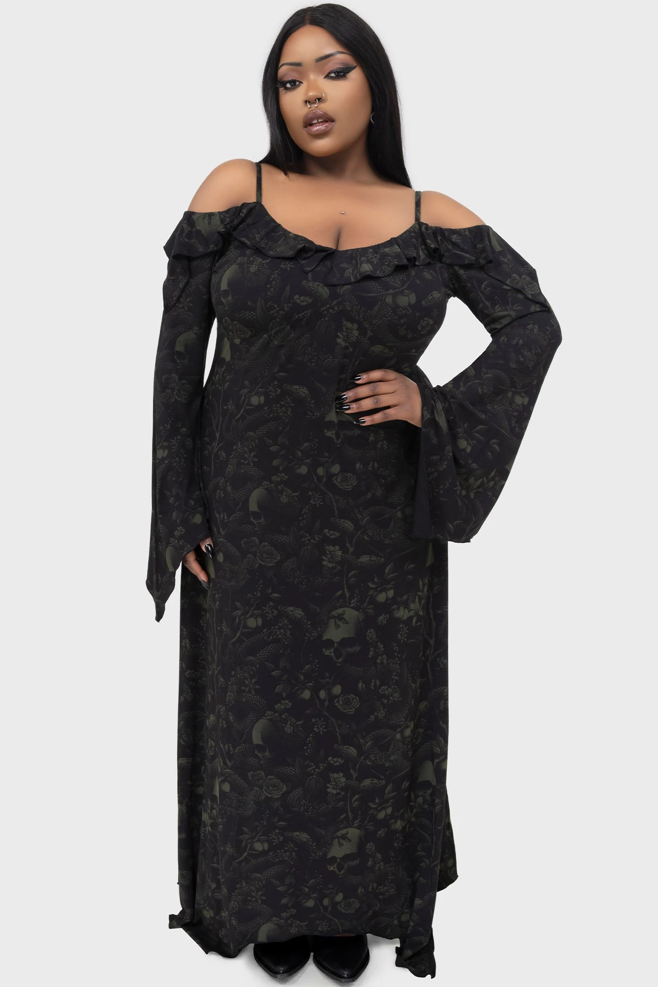 Step into the shadows with the KILLSTAR Eden’s Venom Dress, a masterpiece of gothic fashion designed in Brighton, England. This dress captures the essence of alternative style, combining a hauntingly beautiful custom all-over print with a silhouette that commands attention. Whether you’re attending a midnight gathering or expressing your unique aesthetic, this maxi dress offers the perfect blend of mystery and sophistication.