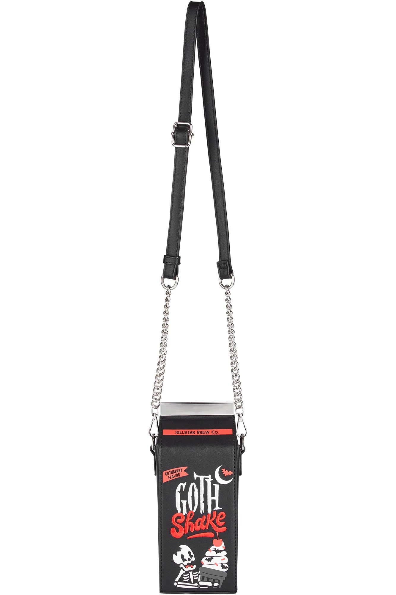 Part of the iconic KILLSTAR collection, the Goth Shake Handbag is a must-have accessory for those who embrace the dark and unique. This novelty milk carton-shaped bag combines alternative aesthetics with everyday functionality, ensuring you stand out in any crowd.