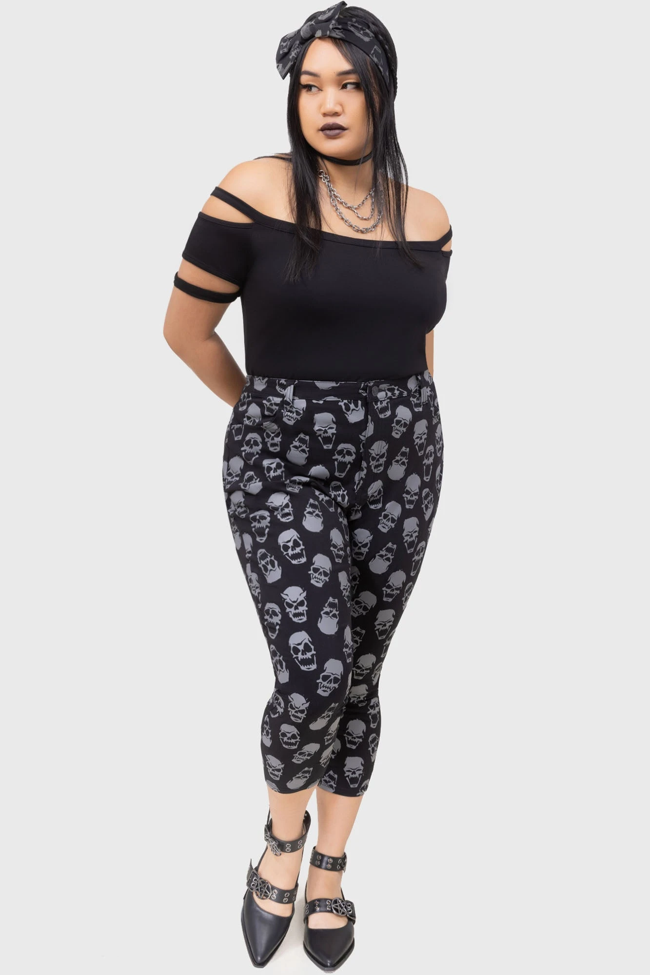 Step into the shadows with the KILLSTAR Heirloom Capri trousers. Part of our signature collection, these capris blend a rebellious aesthetic with a tailored fit, making them a must-have for any alternative wardrobe. Featuring an all-over statement skull print, these trousers are designed for those who live life on the edge without compromising on comfort.