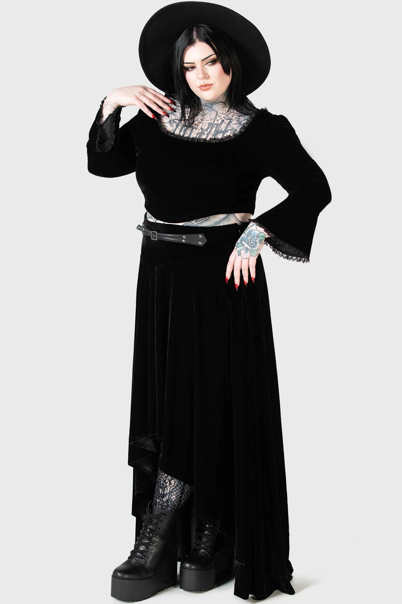 Step into the shadows with the Lucarna Hi-Low Skirt, a standout piece from the KILLSTAR collection designed specifically for a flattering plus-size fit. Crafted from luxurious stretch velvet, this skirt combines gothic elegance with modern comfort, ensuring you make a dramatic entrance wherever you go.