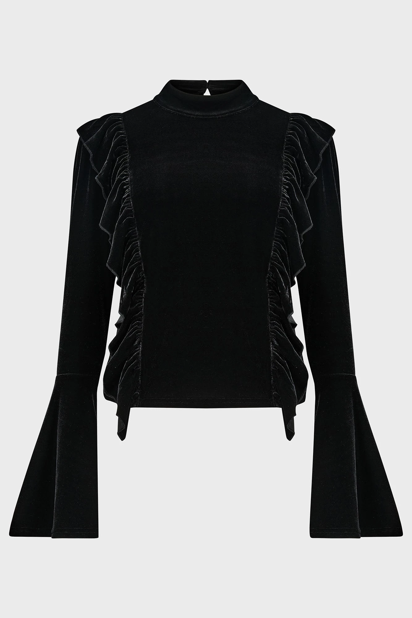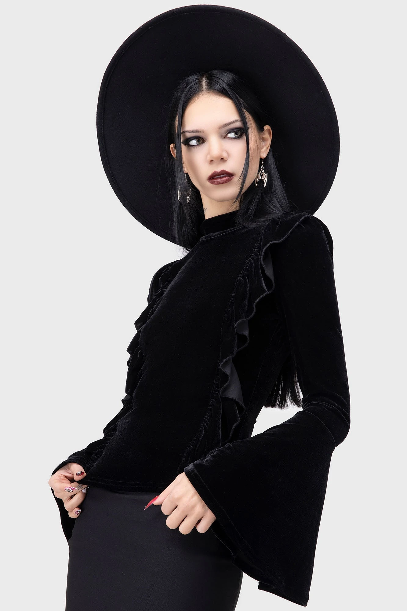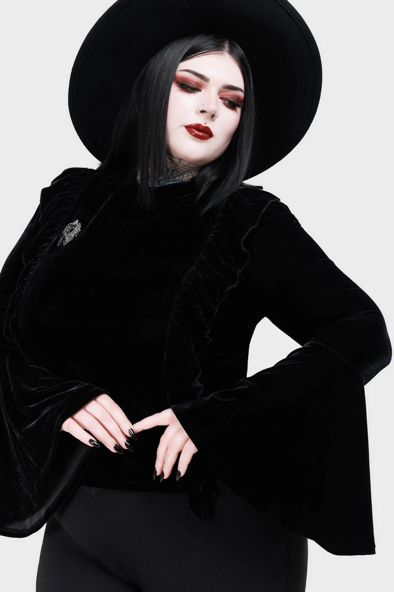 Step into the shadows with the KILLSTAR Noxine Top, a masterpiece of gothic design crafted for those who demand both style and substance. Part of our exclusive collection, this plus-size top combines the opulent texture of soft stretch velvet with dramatic silhouettes, ensuring you stand out in any nocturnal gathering.