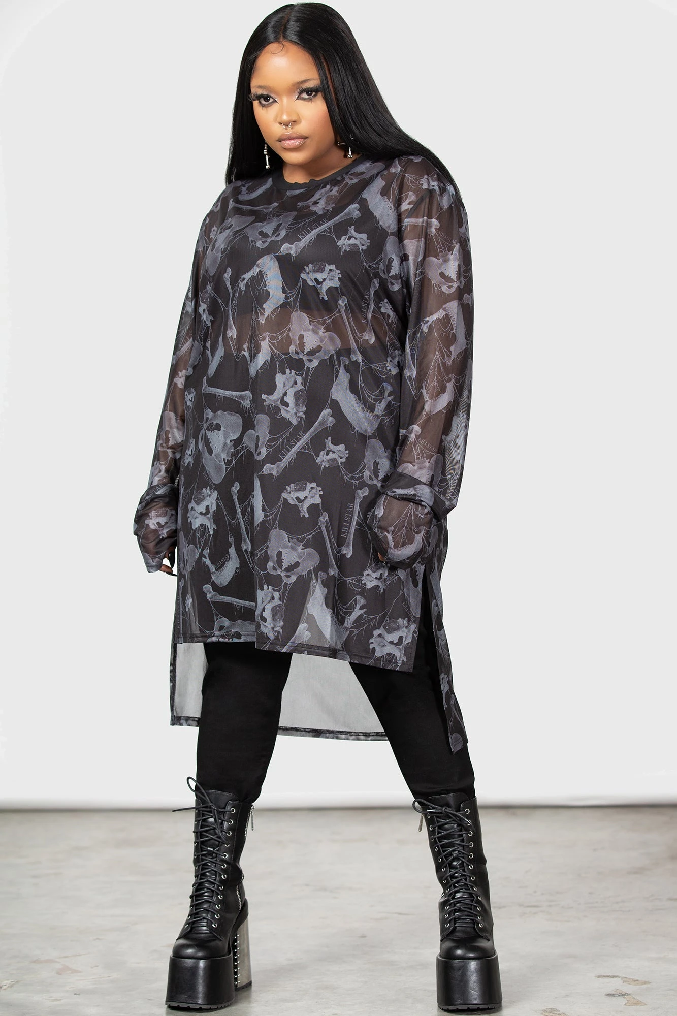Step into the shadows with the KILLSTAR Ossuary Long Sleeve Top, a statement piece designed for those who embrace the alternative. Crafted from high-quality stretch mesh, this top combines comfort with a bold, all-over print that captures the essence of dark aestheticism. Perfect for layering or wearing as a standalone piece, it is a must-have for any modern gothic wardrobe.