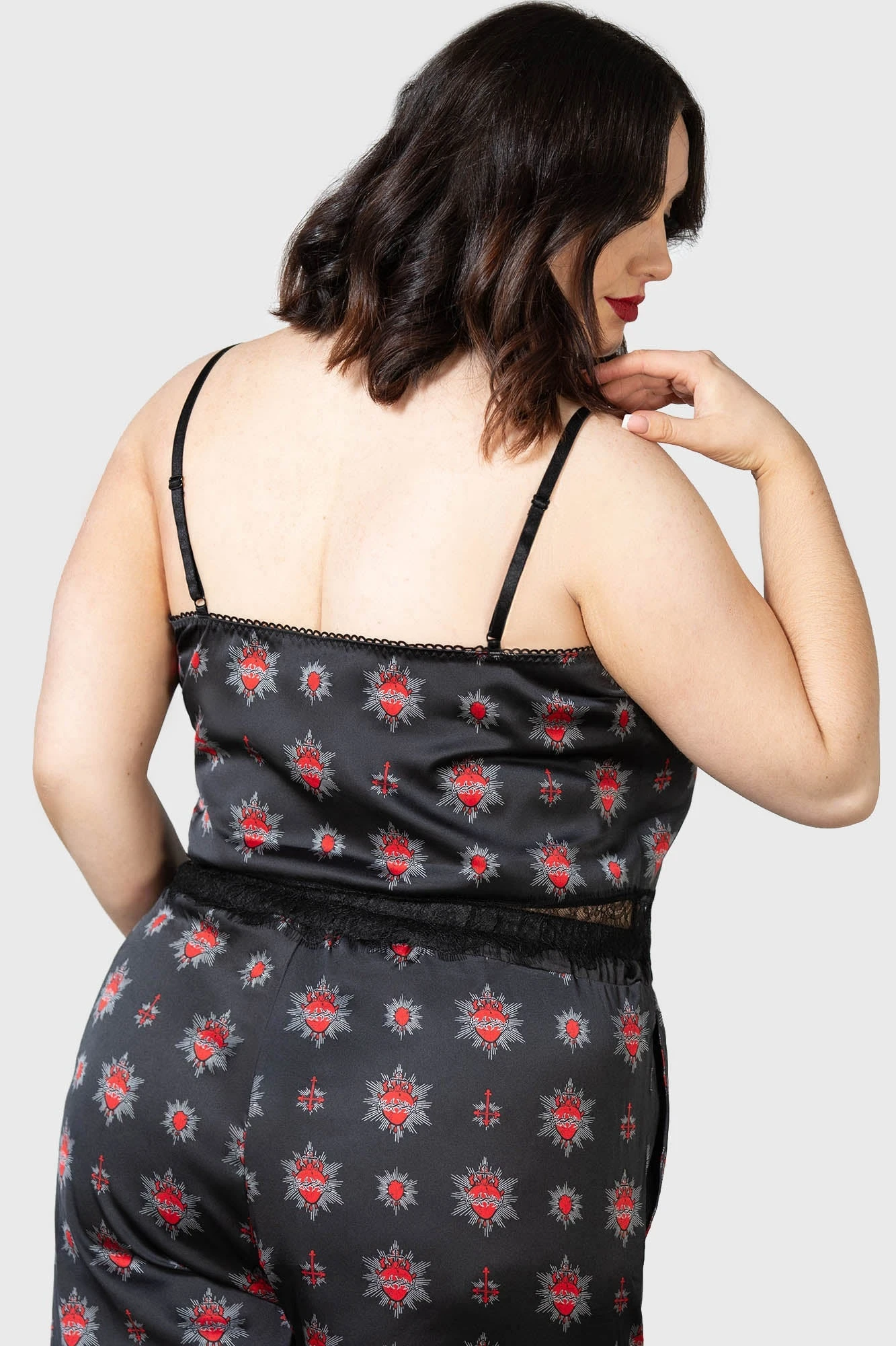 Part of the iconic Killstar collection, the Rosalind Cami Top is designed for those who live for alternative elegance. This plus-size staple combines a sultry satin-look finish with a bold, all-over sacred heart and cross-inspired print, making it the perfect statement piece for your gothic wardrobe.