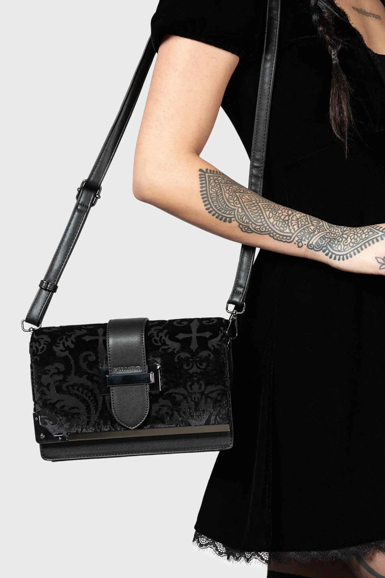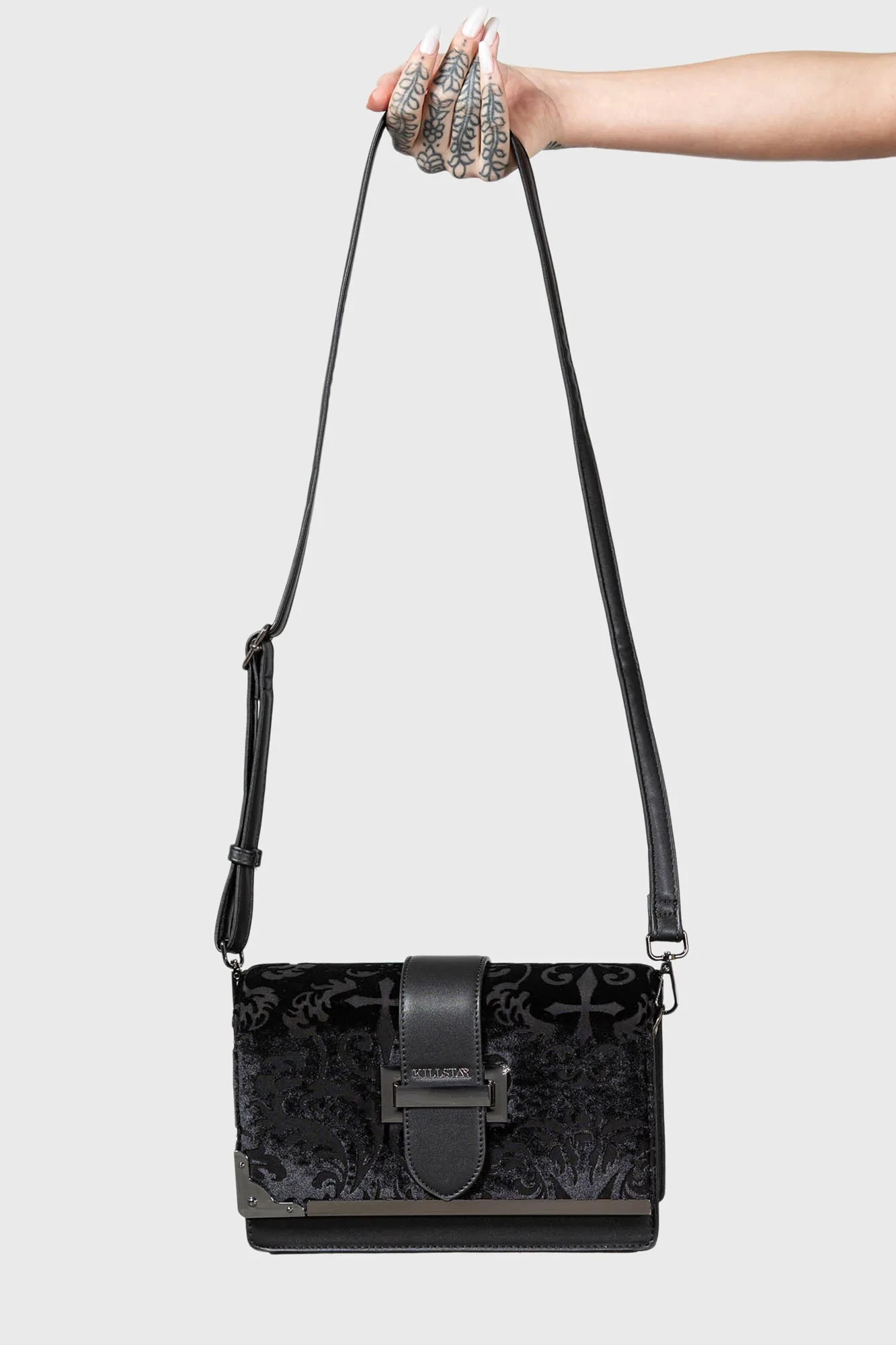 Elevate your alternative aesthetic with the Killstar Salacia Handbag, a masterpiece of dark elegance. Crafted from luxurious burnout velvet, this statement piece adds a touch of gothic sophistication to any outfit, whether you are heading to a ritual or a night out.