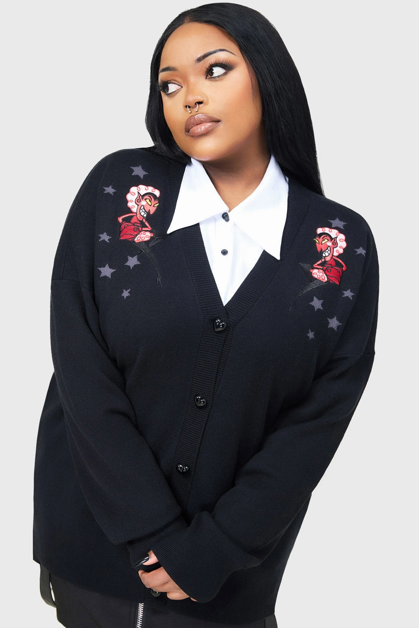 Step into the lair of the most fabulous villain with the KILLSTAR Splendidly Evil Cardigan. Part of an official licensed collaboration, this piece celebrates the iconic ‘HIM’ from The Powerpuff Girls. Crafted from a premium soft-touch knit, this cardigan blends high-fashion alternative style with ultimate comfort, making it the perfect layering piece for those who prefer their fashion with a touch of malice.