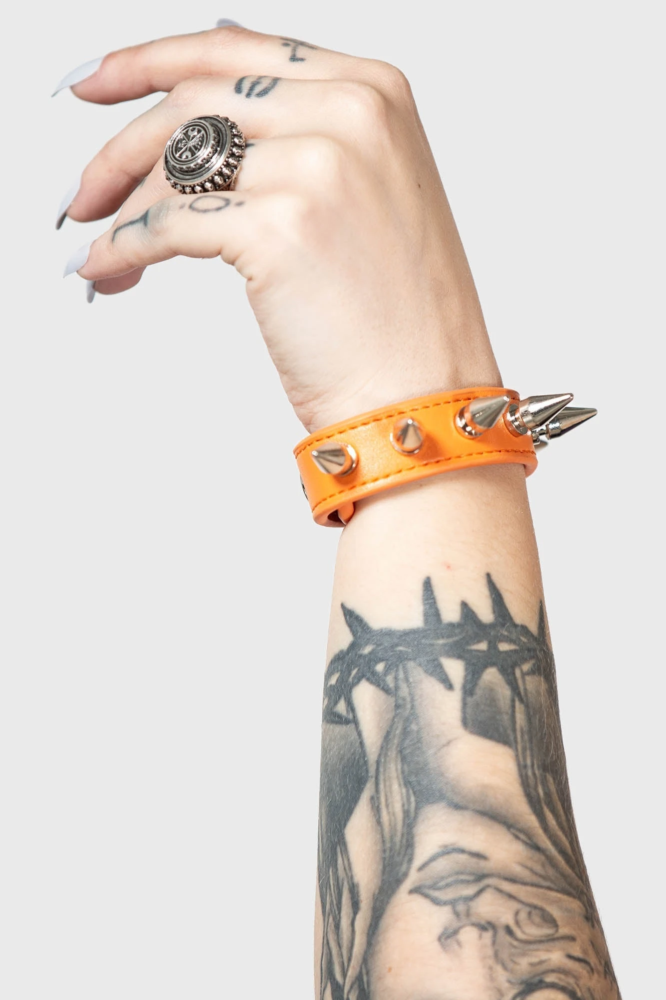 Command attention and set boundaries with the KILLSTAR Stay Away Spike Bracelet. This striking accessory combines a vibrant orange hue with menacing metal studs, creating a high-contrast piece perfect for those who live life on the alternative edge. Designed as part of the official KILLSTAR collection, it provides an instantly recognizable gothic aesthetic that pairs perfectly with monochromatic outfits or bold streetwear.