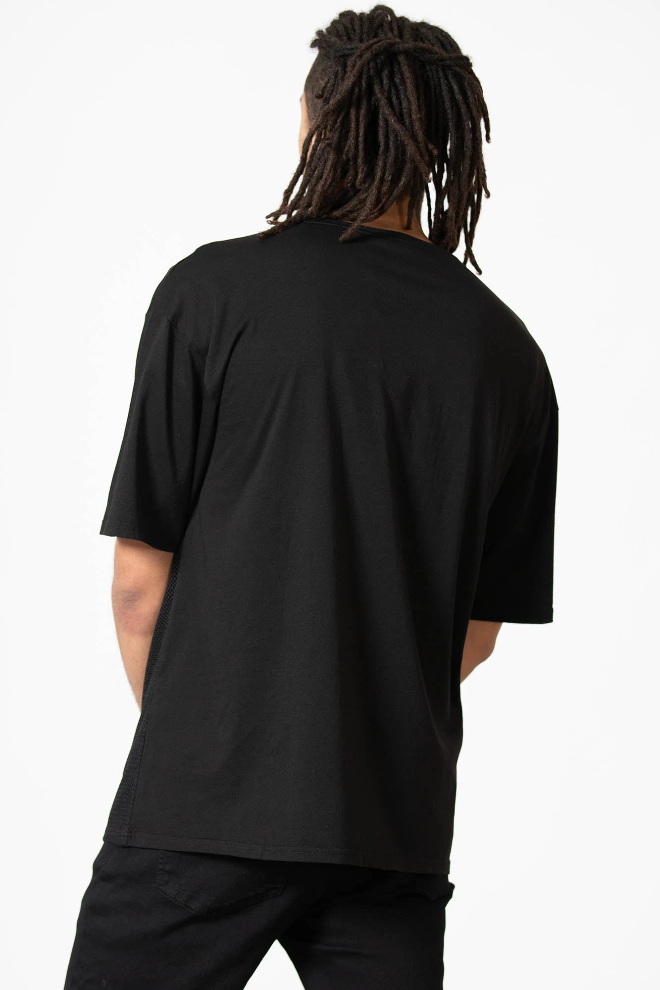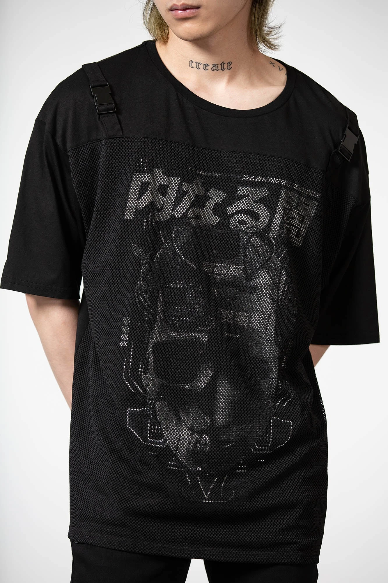 - Industrial Aesthetics: Featuring a striking statement graphic on the front paired with intricate fishnet overlay detailing for a bold, multi-dimensional look.