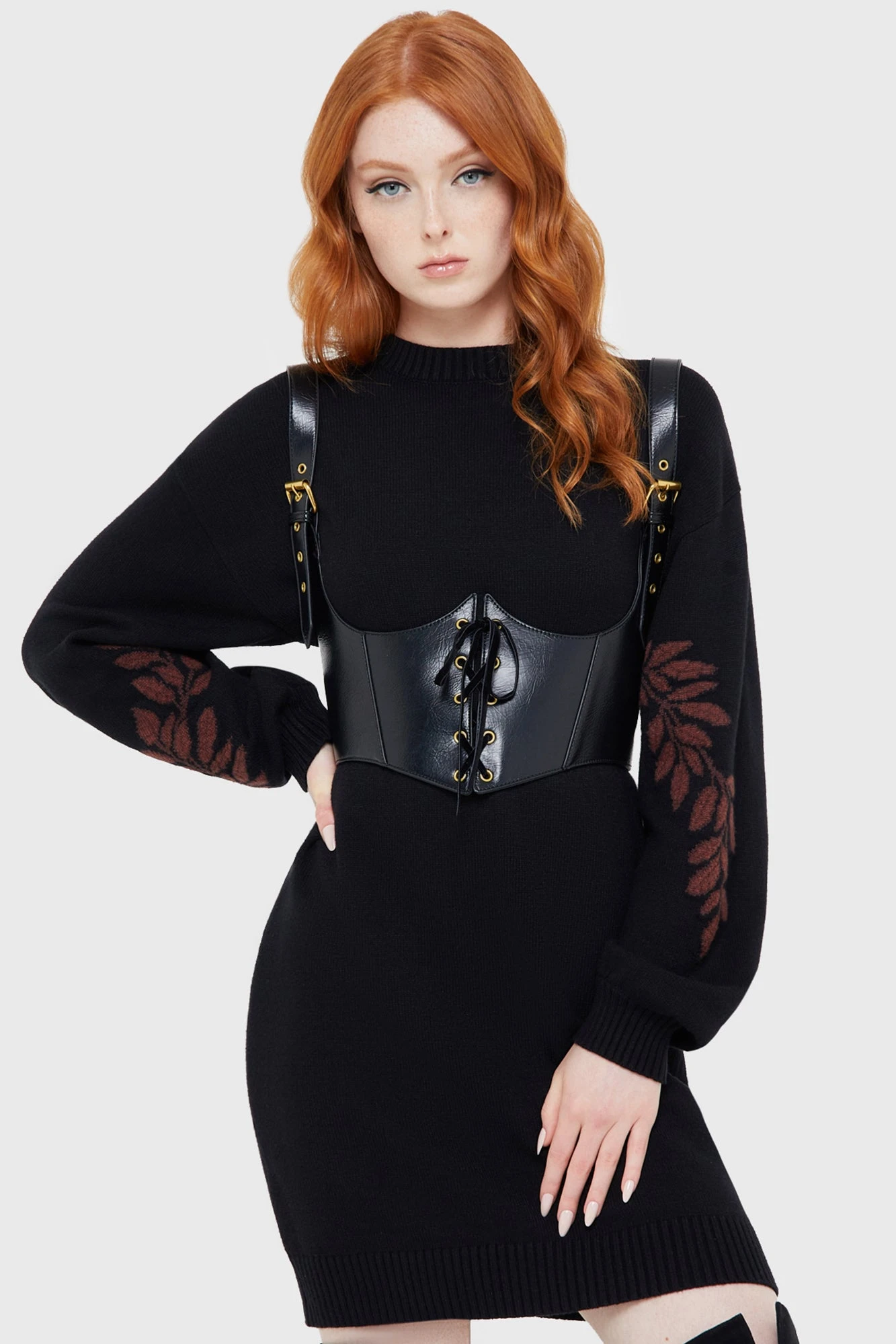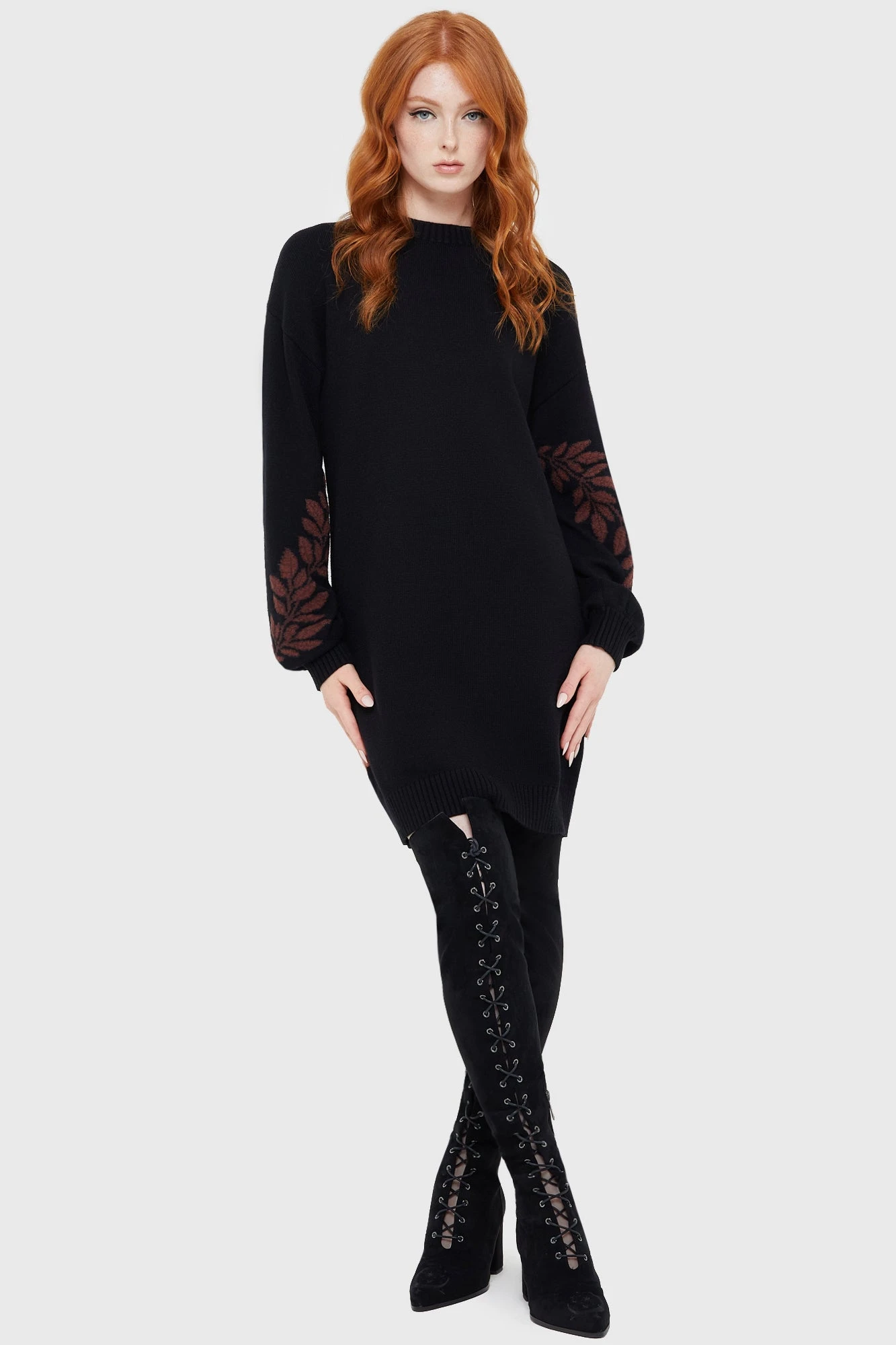 - Intricate Statement Sleeves: Features a beautiful leaf design knitted into the long, cuffed sleeves for a botanical-inspired gothic look.