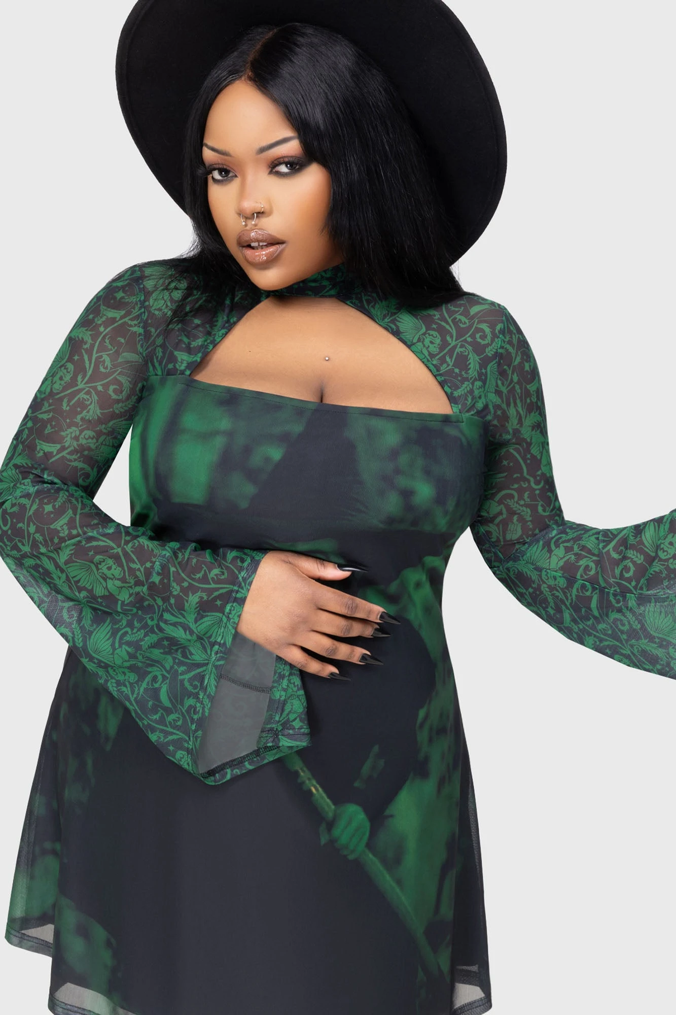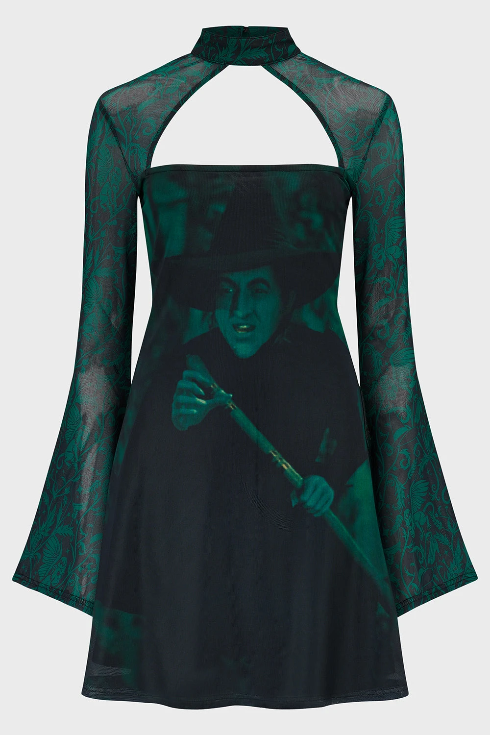 - Dynamic Silhouette: The mini-length cut is paired with dramatic long flared sleeves for a gothic, ethereal look.