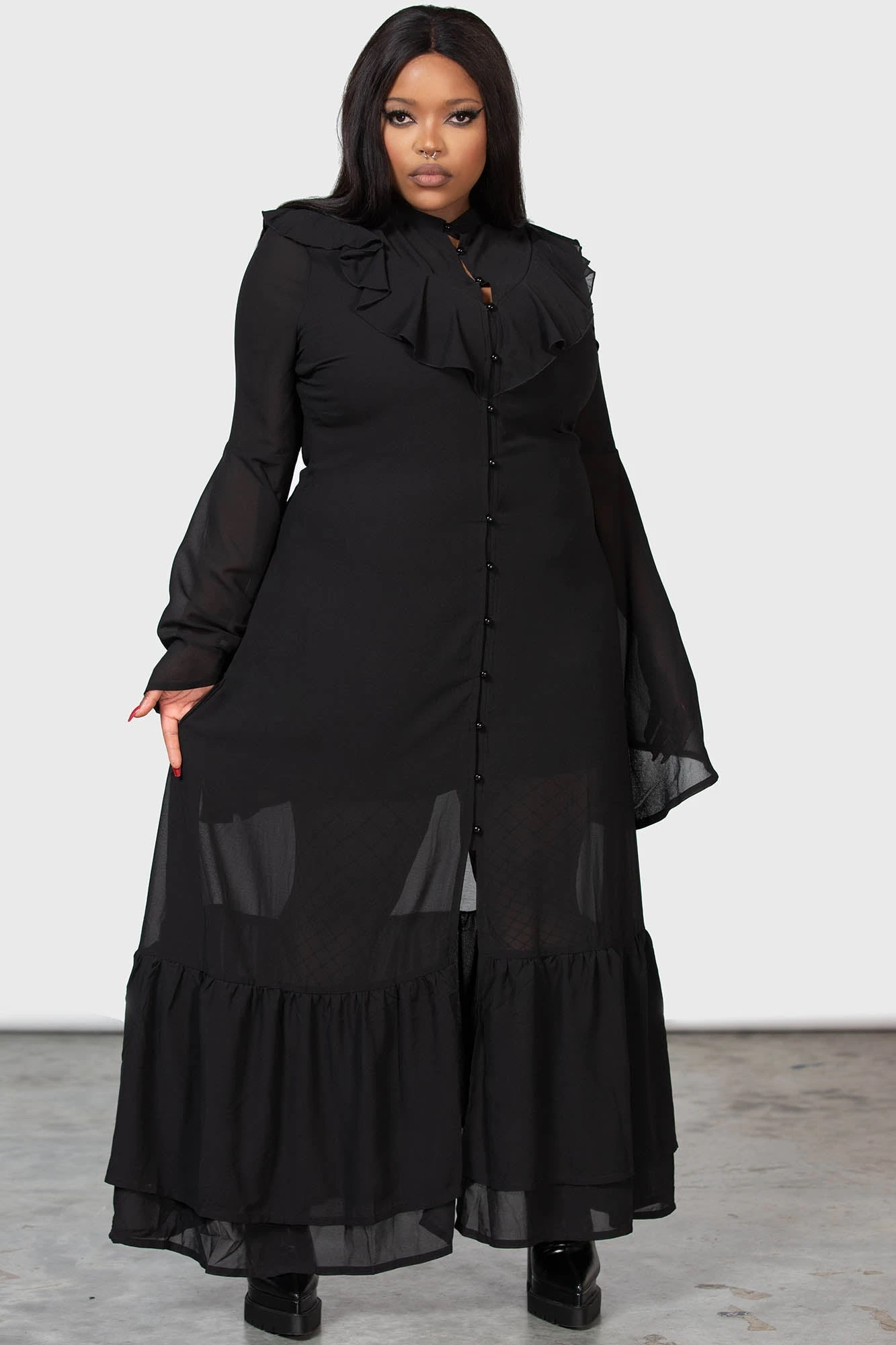 Step into the ethereal world of the Killstar Valentine collection. This stunning plus-size maxi dress combines intricate gothic details with a flattering silhouette, designed to make a statement. Crafted from delicate mesh with romantic ruffles, it is the ultimate piece for those who command attention with an air of dark elegance.