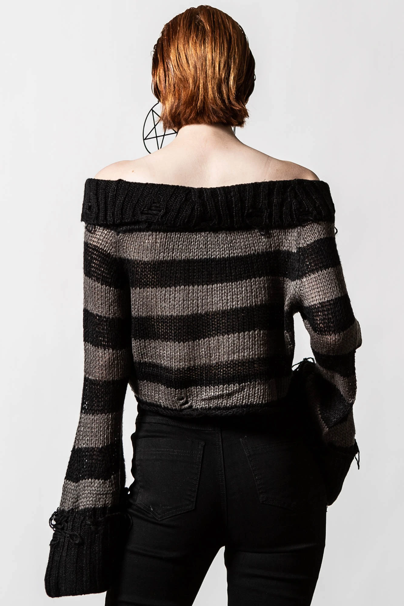 Only in darkness can we glimpse the fullest light our soul carries. The Killstar ‘Visage’ knit sweater is conjured from a super-soft fabric, blending a flattering silhouette with ultimate comfort. This essential piece features an elegant bardot neckline and bold contrasting stripes, finished with distressed details for an edgy, gothic aesthetic. Whether you are heading out with your coven or planning a moonlit picnic, this versatile crop top is a dream to style with your favorite alternative looks.