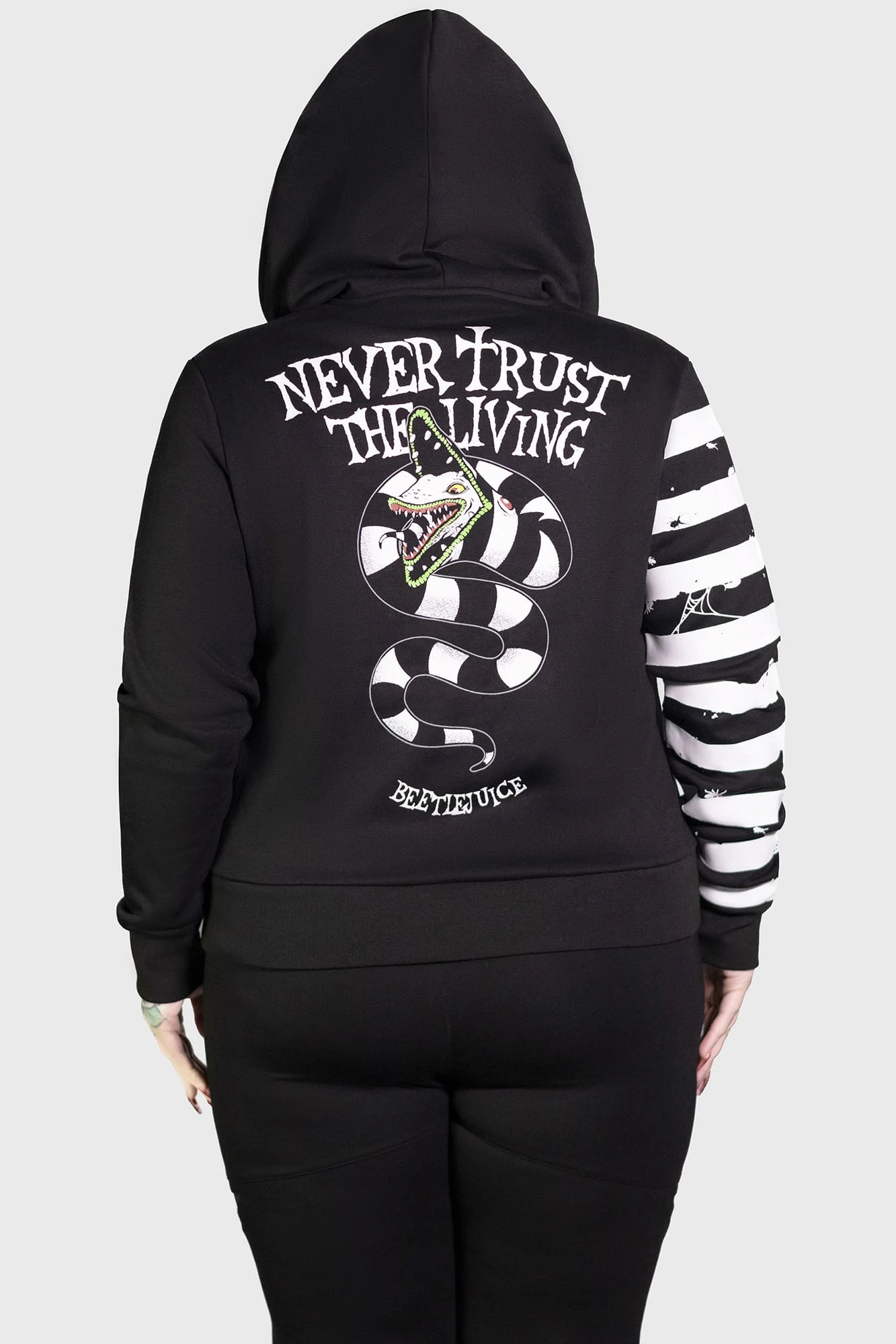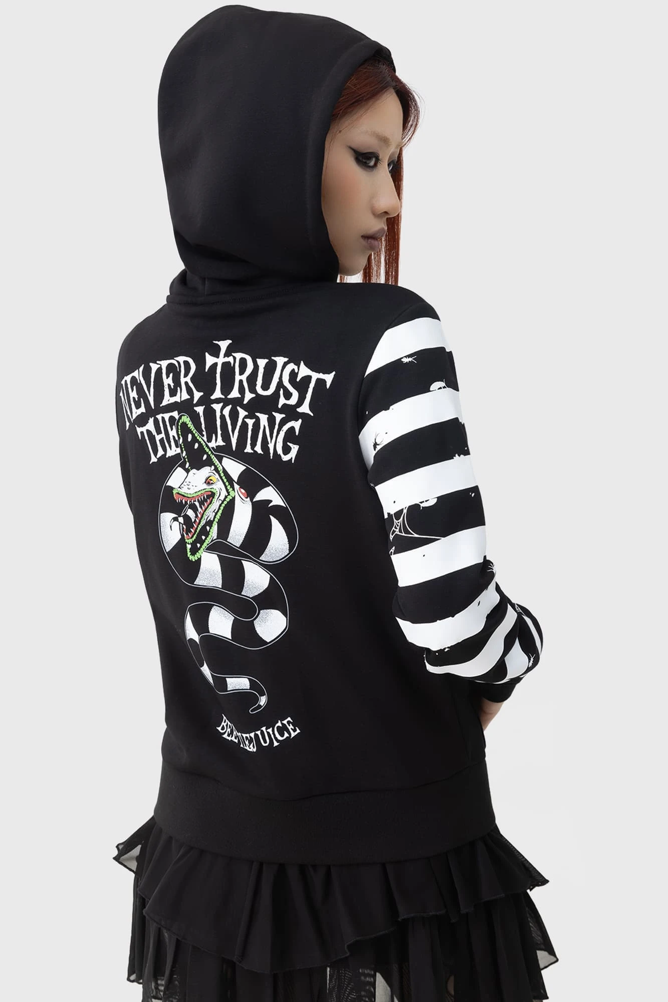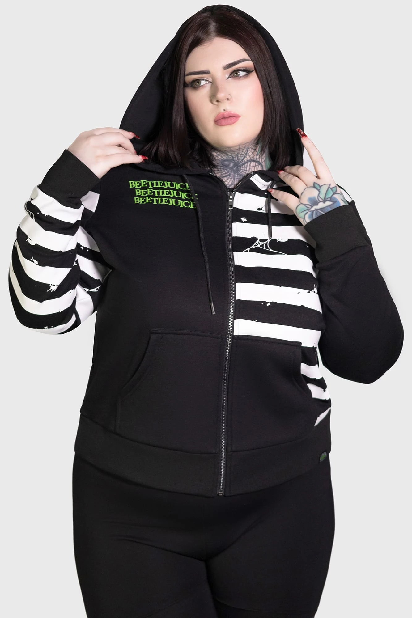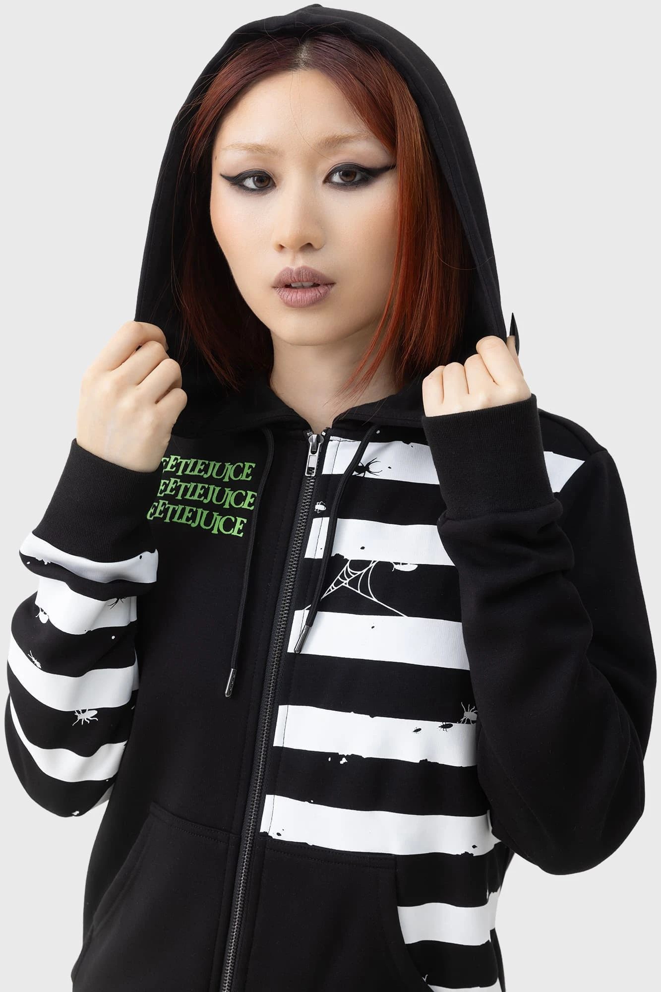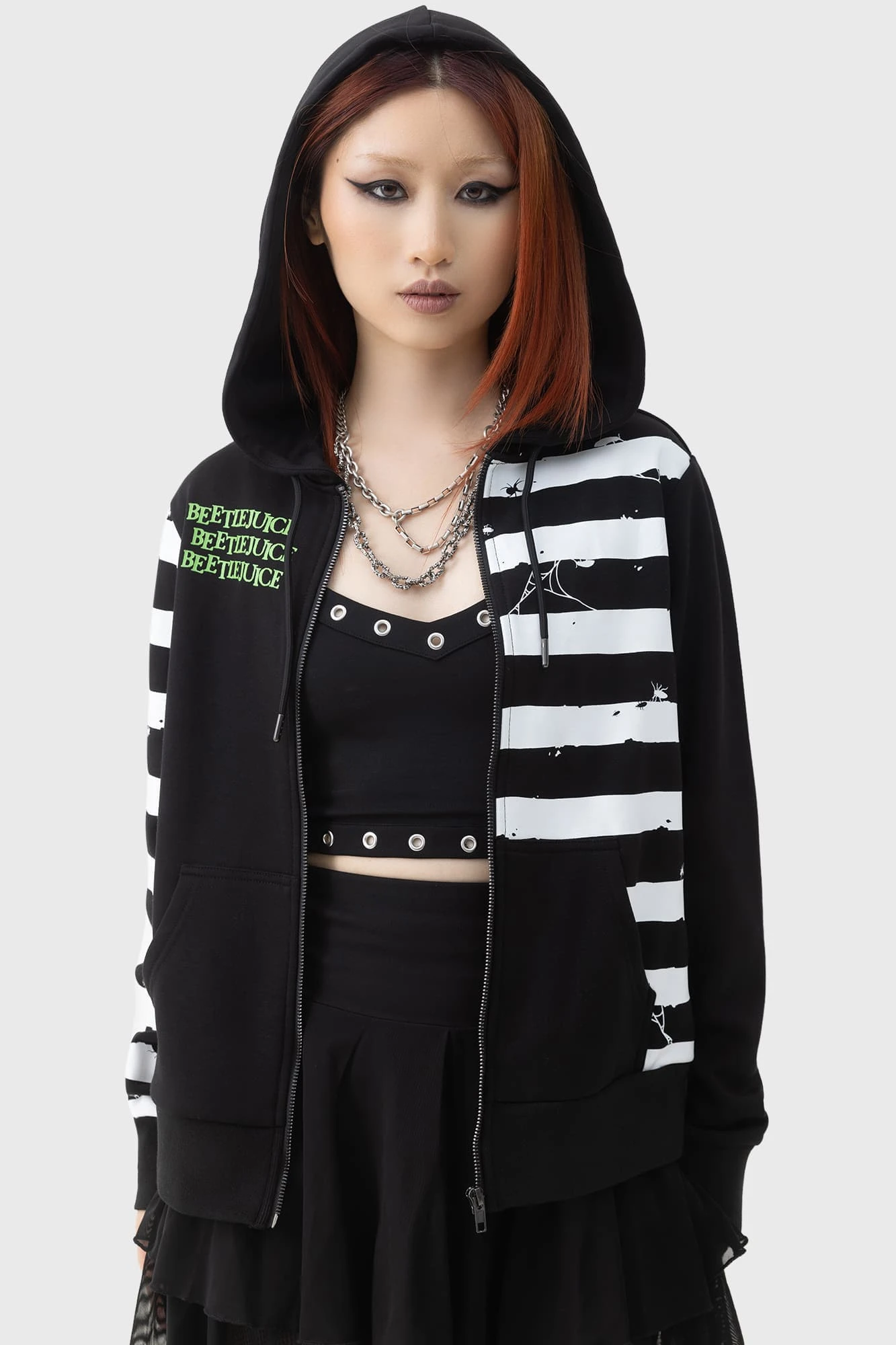 Step into the Neitherworld with the official Killstar x Beetlejuice collaboration. This Distressed Stripe Hoodie combines iconic gothic aesthetics with premium comfort, making it a must-have for fans of the ghost with the most. Whether you’re haunting the attic or hitting the streets, this licensed piece ensures you do it in true Tim Burton-inspired style.