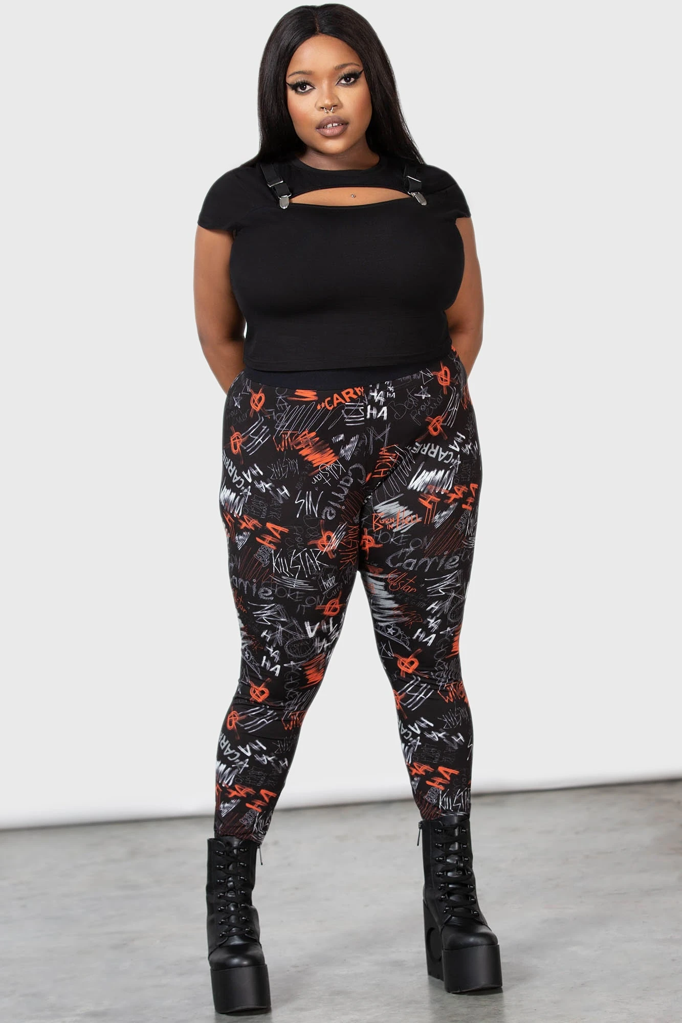 Embrace the dark side of cinema with the official Killstar x Carrie Leggings. Part of an exclusive collaboration, these plus-size leggings bring the haunting legacy of the 1976 horror classic to your everyday wardrobe. Combining iconic movie imagery with the rebellious spirit of alternative fashion, these leggings are a must-have for fans of the legendary Stephen King adaptation.