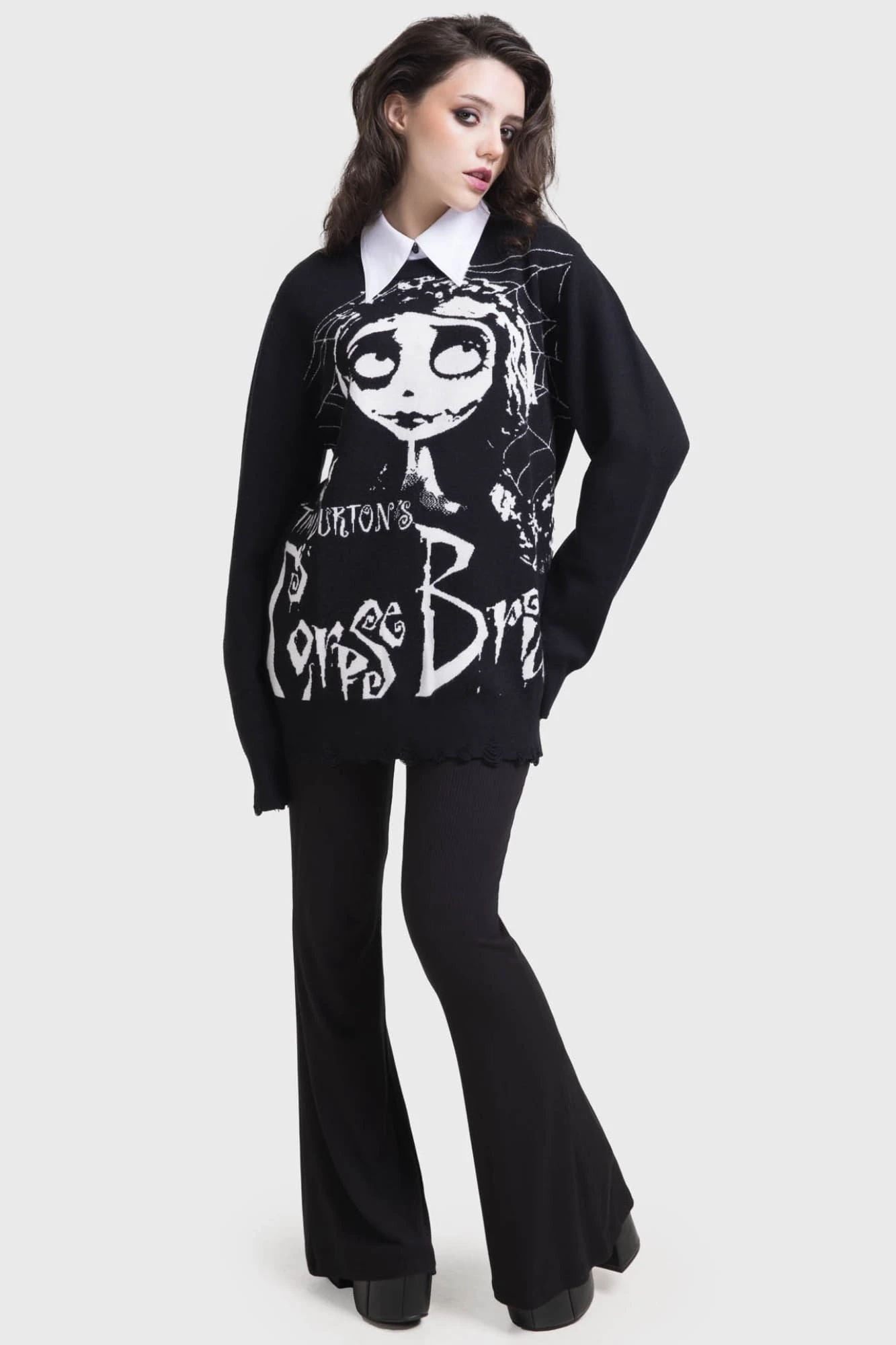 Step into the whimsical world of Tim Burton with the official Killstar x Corpse Bride collaboration. This distressed knit sweater blends gothic charm with modern alternative style, featuring the iconic imagery of the beloved film. Perfect for fans who want to showcase their love for the cult classic while maintaining a sharp, grunge-inspired edge.