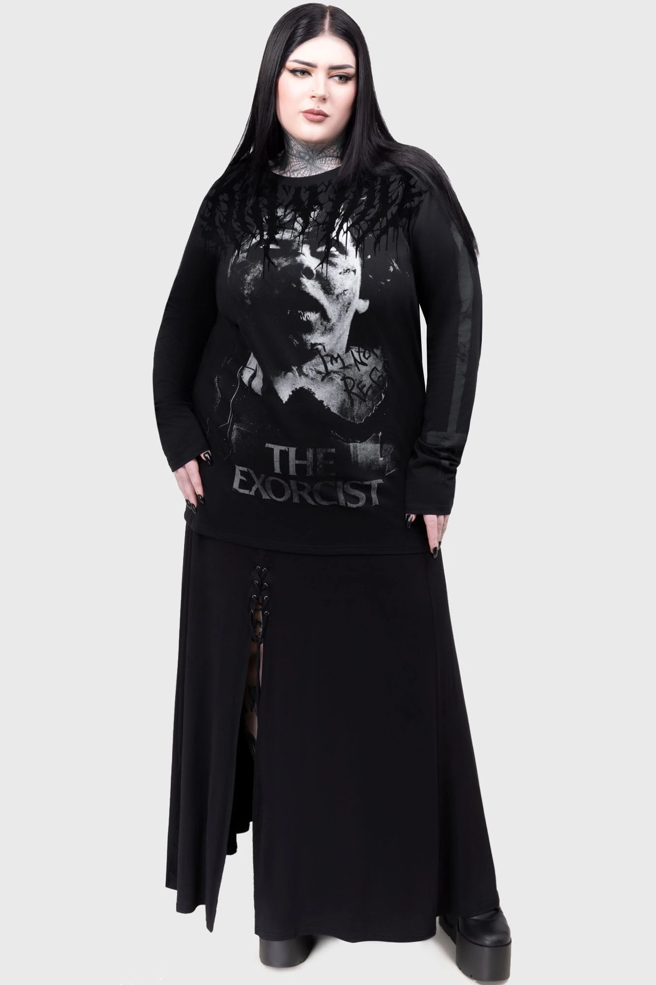 Step into the shadows with the official KILLSTAR x The Exorcist collaboration. This “I’m Not Regan” long-sleeved top combines the chilling legacy of the cult classic horror film with premium alternative design, offering a standout piece for fans of the supernatural and high-quality gothic fashion.