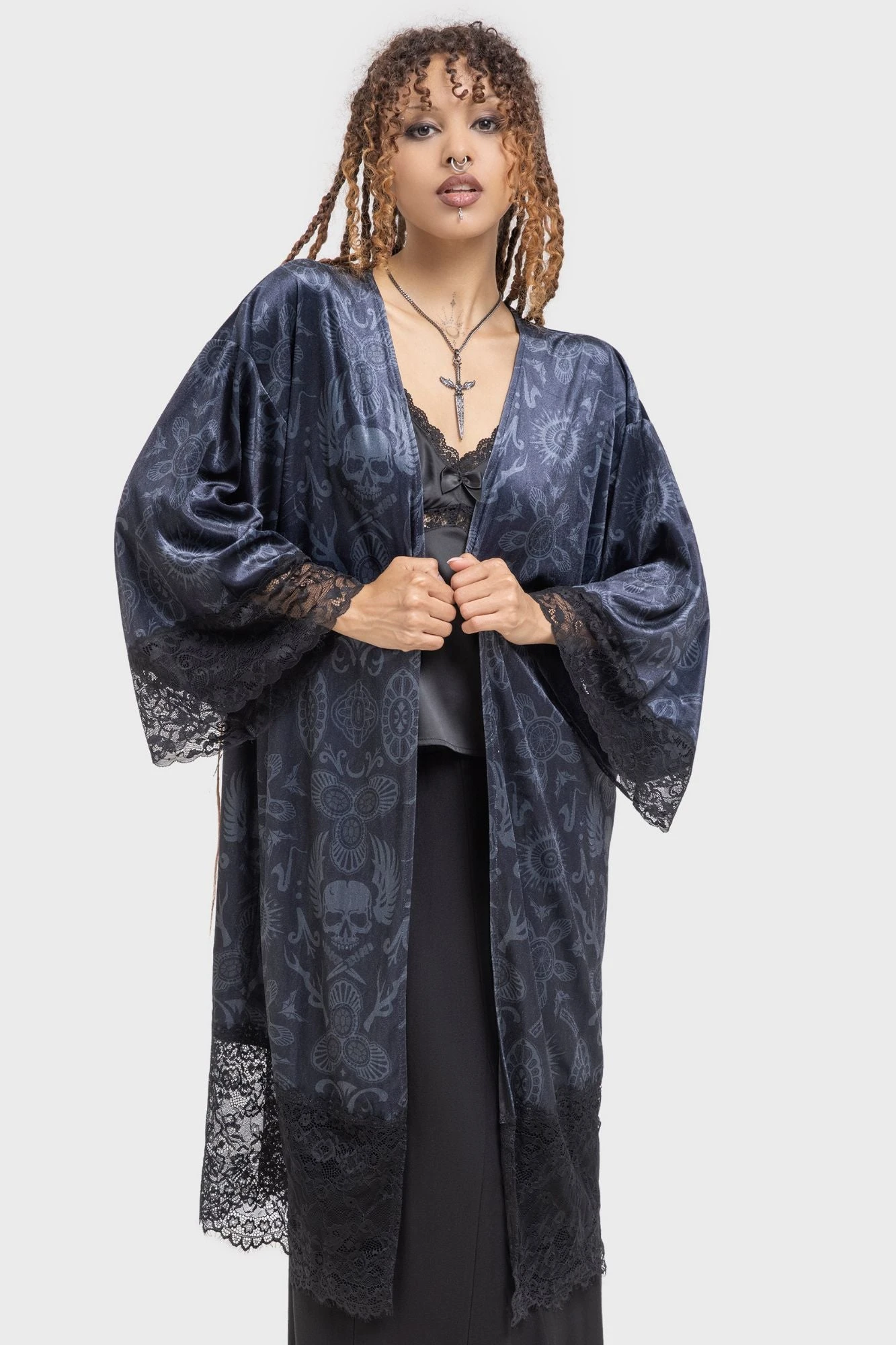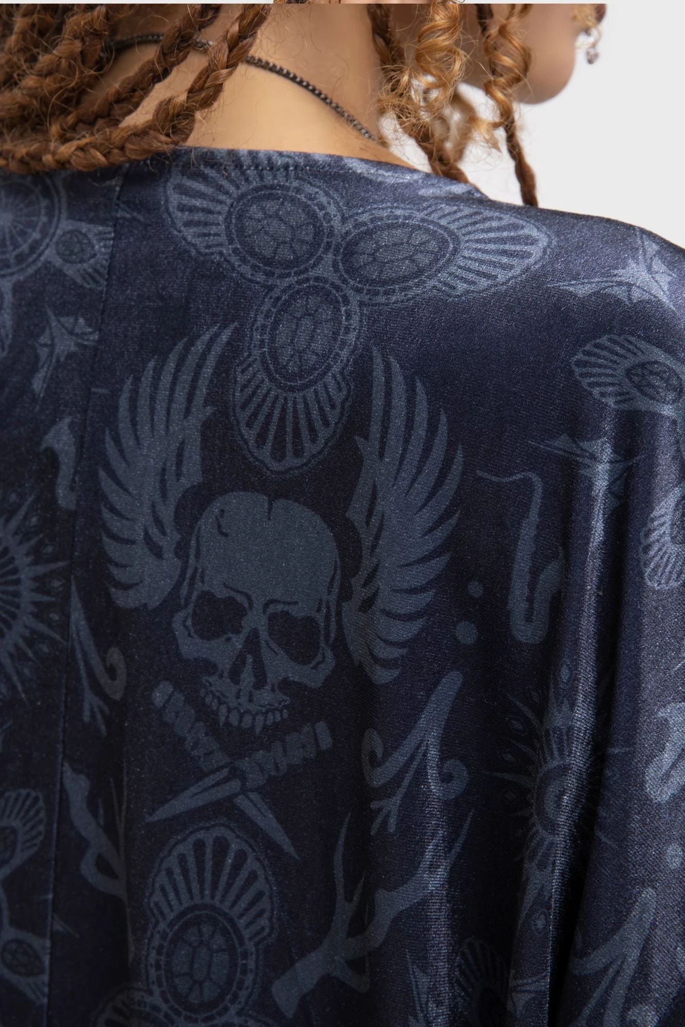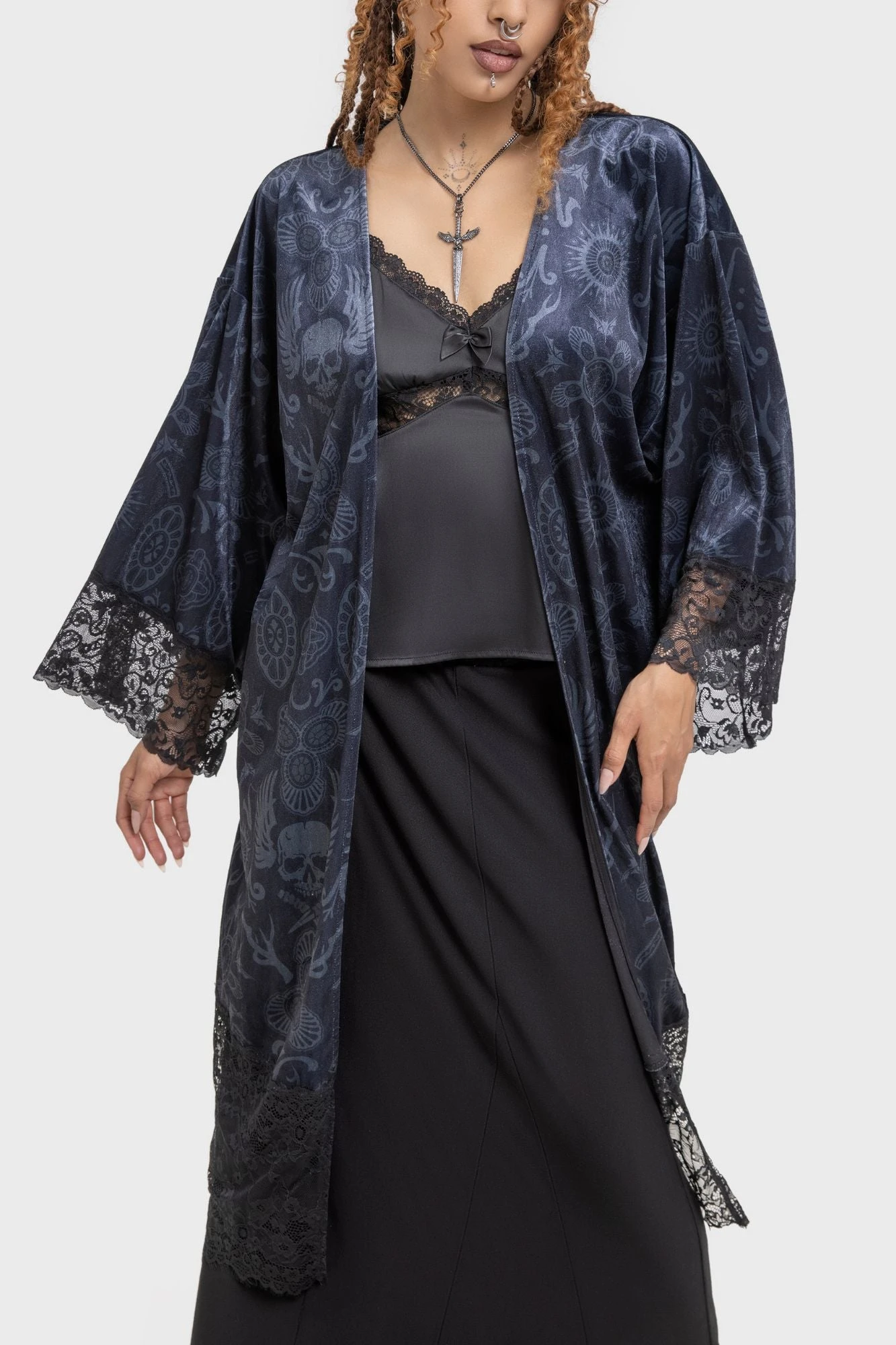 Embrace the eternal night with this official collaboration between KILLSTAR and the cult classic film, The Lost Boys. This striking velvet kimono blends dark cinematic nostalgia with contemporary gothic elegance, making it a must-have statement piece for any midnight wardrobe.