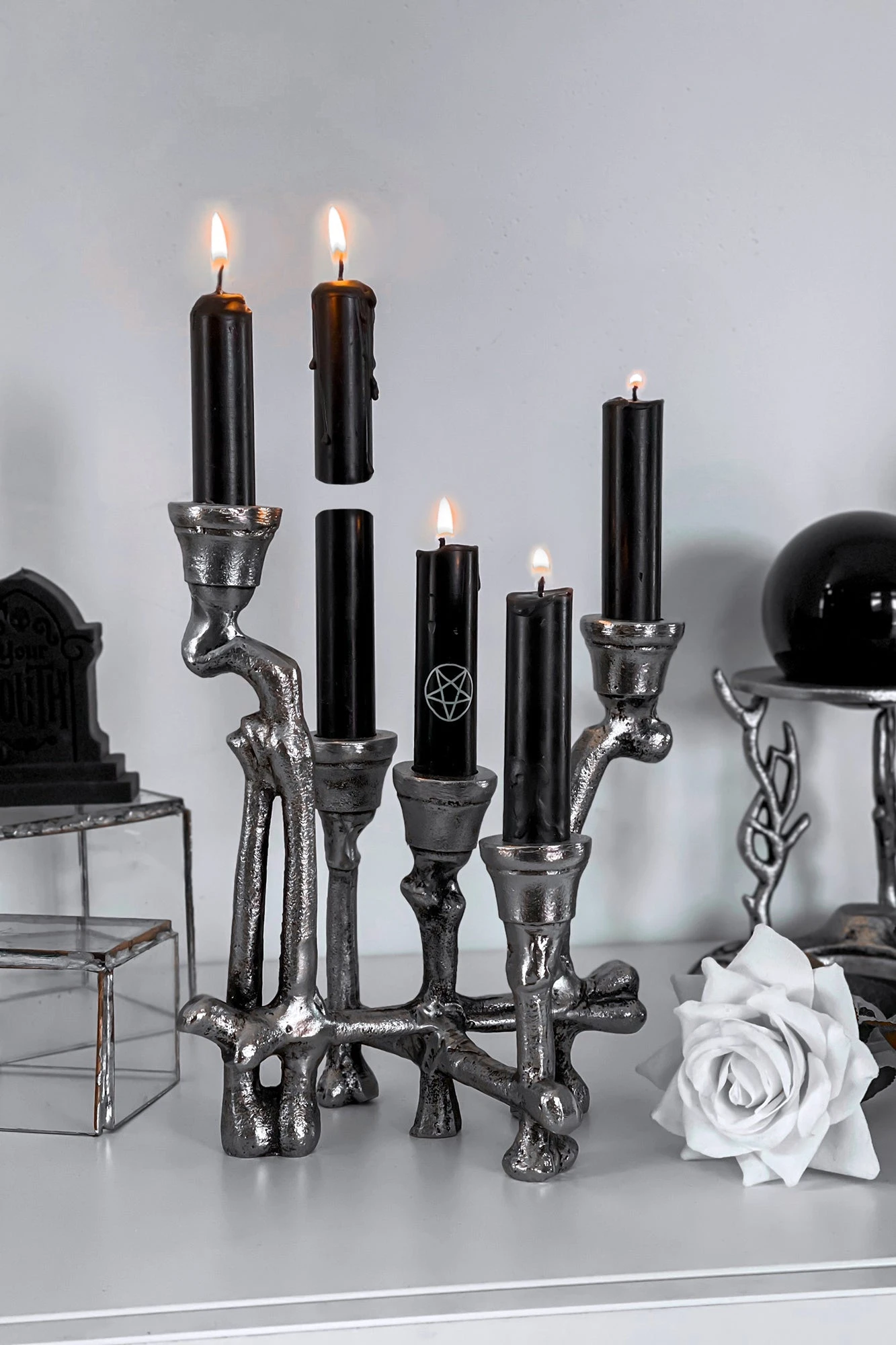 – Statement metal sculpted candelabra.