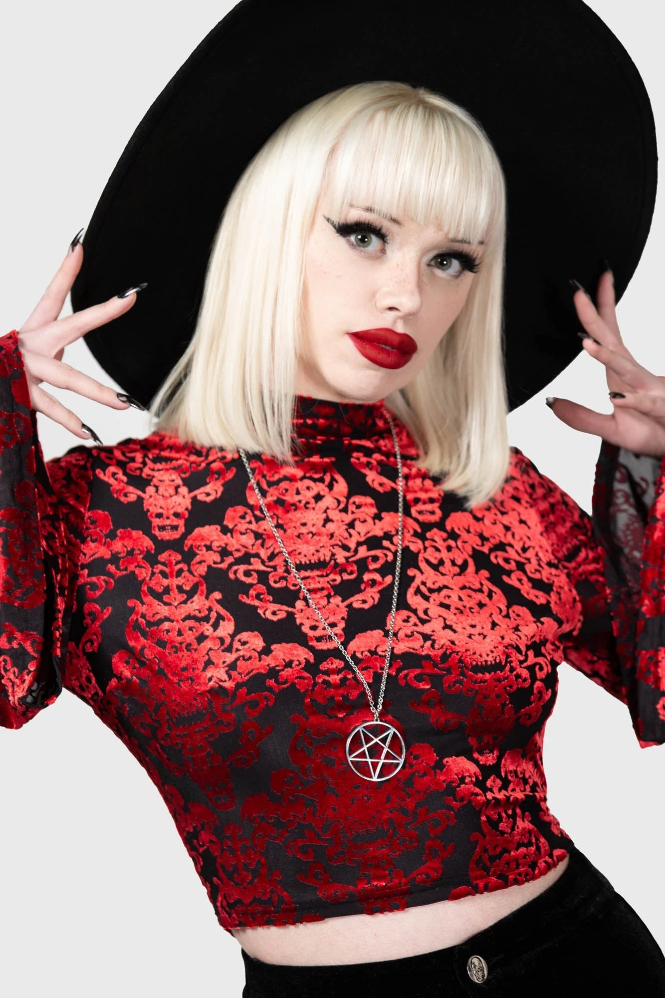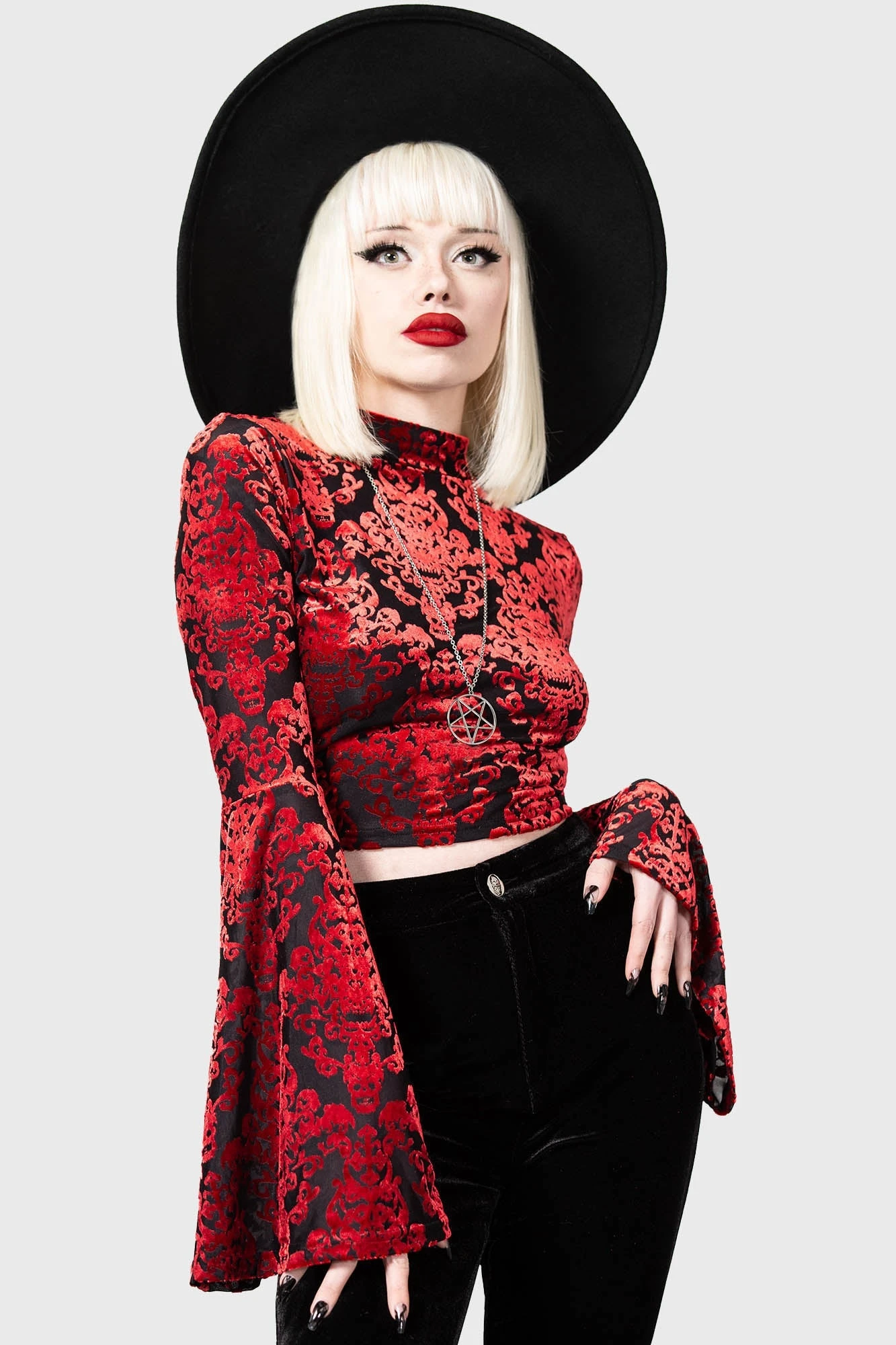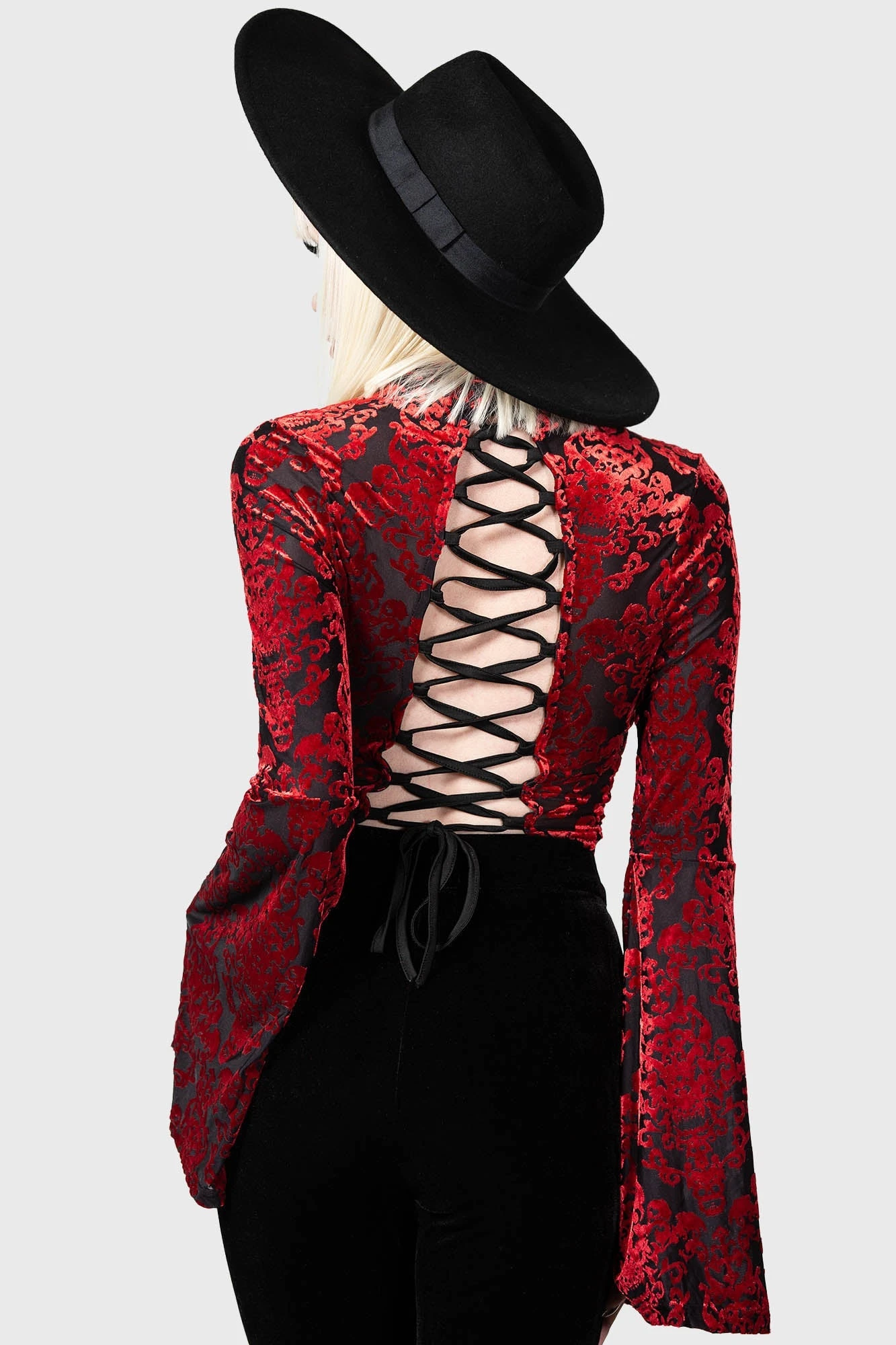 – Statement, soft stretch burnout velvet fabric.